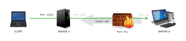Le port 22222 correspond à l'entrée du tunnel sur SERVEUR_A, qui débouche sur le port 22 de SERVEUR_B. Autant le port d'entrée du tunnel peut être choisi — presque — librement, autant le port de sortie doit correspondre au port d'écoute du serveur SSH sur SERVEUR_B.